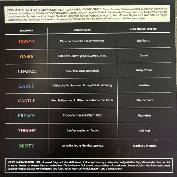 Die Marke Montreal Original stammt aus Kanada und nutzt die Kaltextraktion, bei der die Aromen direkt aus echten Tabaksorten gewonnen werden. Dieses Verfahren sorgt für einen besonders authentischen und naturgetreuen Tabakgeschmack, der sich deutlich von synthetischen Liquids unterscheidet.